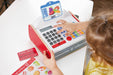 Little learners run their own grocery store and practice money management with this realistic cash register! Use the light and sound scanner to ring up the food order, and figure out the total using the solar-powered calculator! Open the drawer in the wooden register to make change from the included bills and coins. A great way to practice money handling on both sides of the register! Requires 2 AA batteries, not included.