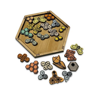 Pack-it-in style puzzle made entirely of bamboo. Arrange the pieces so that all bees fit into the hive.