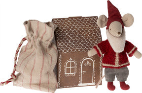 Meet the Maileg Santa Mouse, dressed in classic Santa clothes and ready for Christmas magic! He lives in a cozy little house and carries a sack full of presents to deliver on Christmas night. Perfectly sized to slide down the chimney of the Mouse Gingerbread House, he brings festive fun and holiday cheer to your little one’s playtime.
