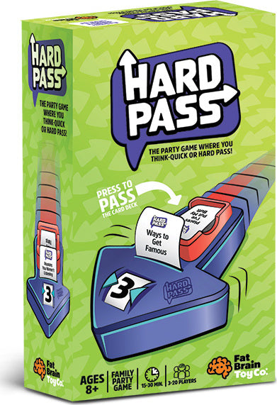 Hard Pass Party game of quickly completing fun, funny, and awkward prompts Encourages family bonding, quick thinking, hilarity Pick a card, place it in the slot on the arrow device. Press down on the cardholder to send the arrow rolling to the player of your choice Player to receive the arrow can either complete the prompt or "hard pass" it to someone else.