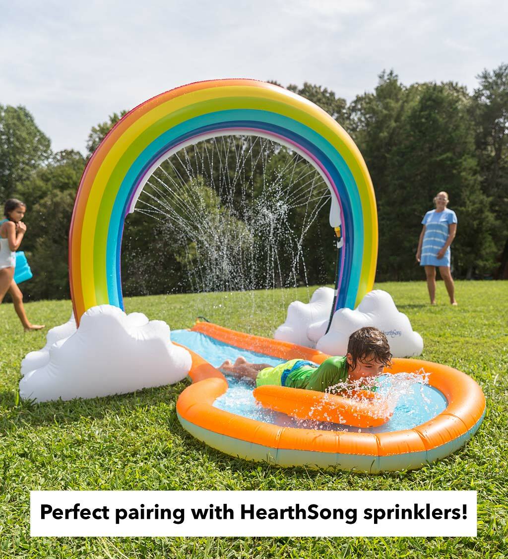 Backyard summertime fun at its best —the 12-Foot Inflatable Water Slide is the perfect way for kids to cool off on a hot summer day! The sprinkler running along one side creates a continuous mist of slippery water along the pathway. Two inflatable speed boards are included to cushion every splash landing; just clutch the speed board, run, and slide. Kids splash to a stop in the attached water-filled pool. Jump, slide, splash—and repeat!