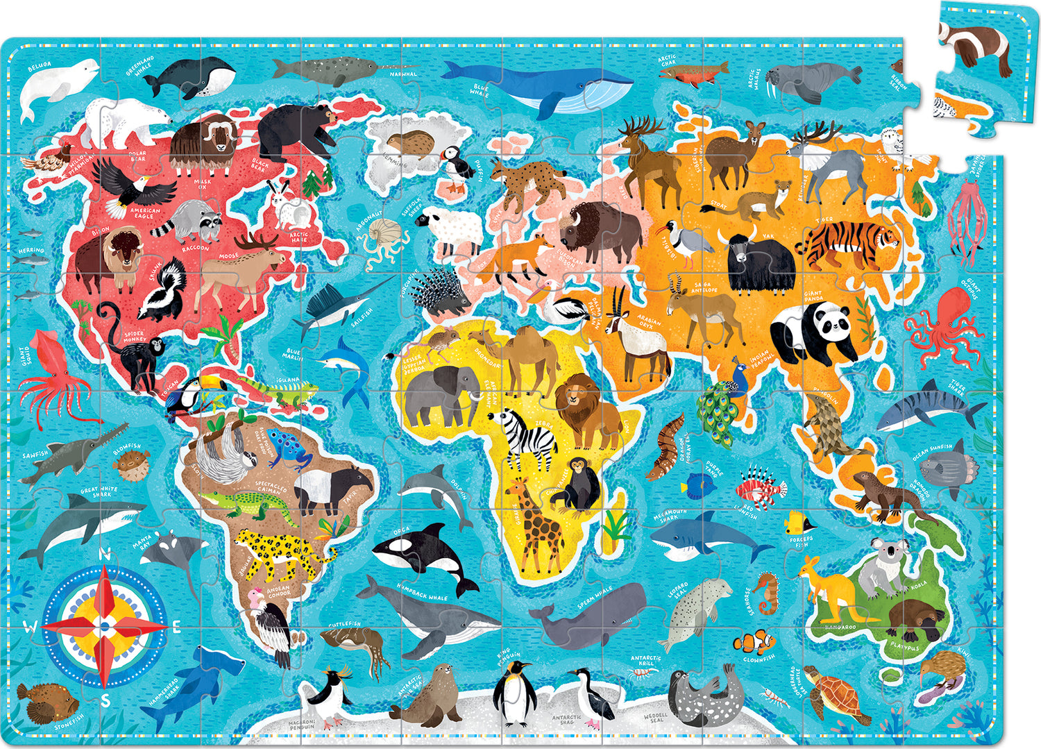 Large 60-element educational puzzles depict continents, oceans and animals that inhabit different corners of the globe. It is a great inspiration for children, to get to know the fascinating animals of the world and be inspired for long journeys.