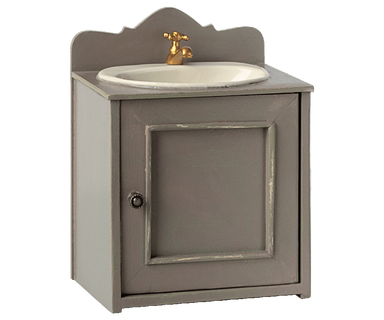 A beautiful vintage metal sink with a golden water tap. The sink with wooden storage shelves, where you can store your personal belongings.The pain...