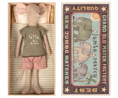 This medium size mouse now comes in a matchbox! This handsome boy comes wearing a green tee and red shorts. He sleeps in his box with cozy bedding...