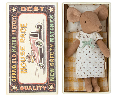 A classic Maileg item. This mouse is ready for hours of play and sleeps tight in a little matchbox. The clothes and bed linen come in unique prints...