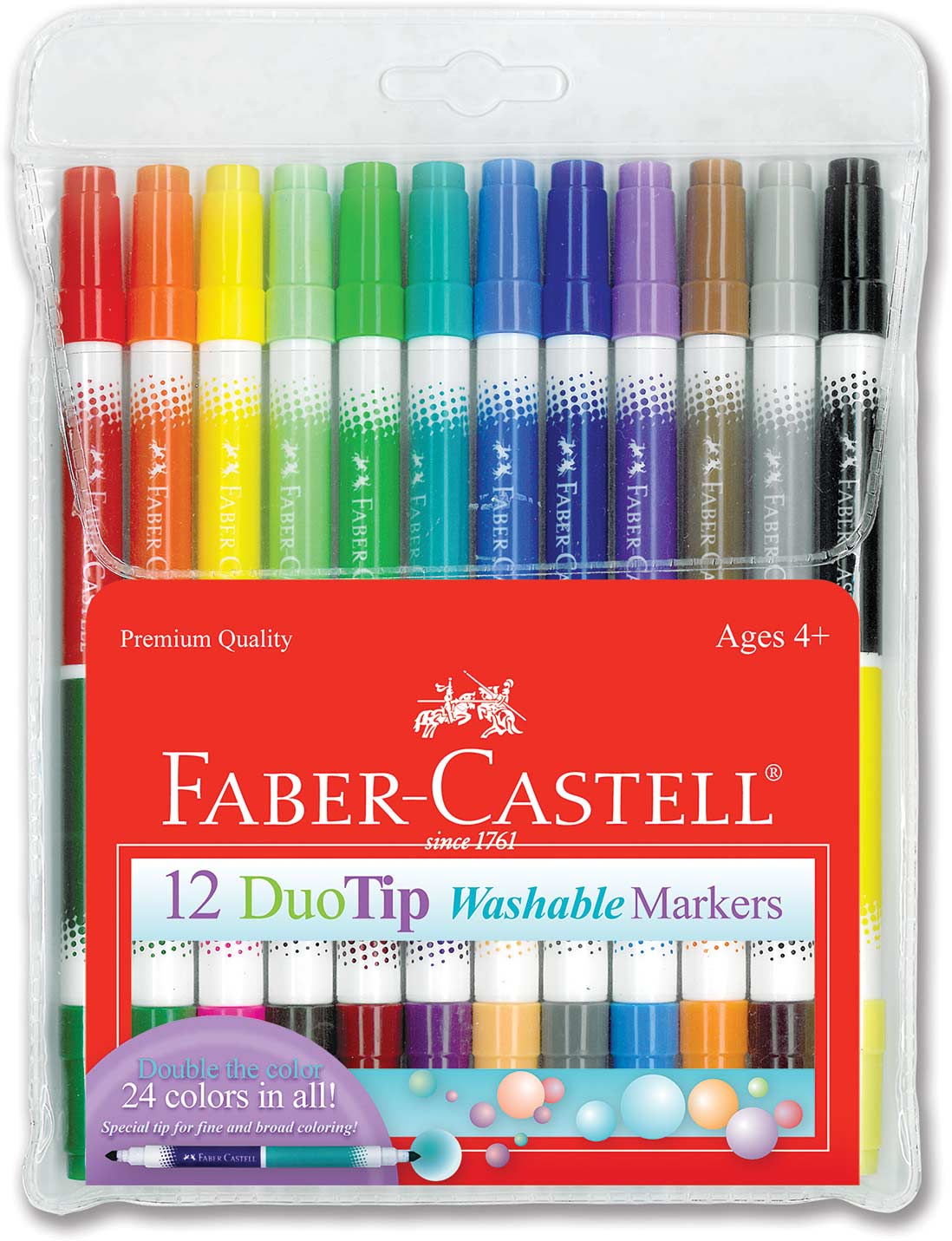 -Duo-Tip Markers mean twice the colors for double the coloring fun! All Faber-Castell markers have bright, washable inks for easy clean up -These markers have long-lasting, water-based ink which allows them to be re-hydrated by placing the nib in water -The markers have a ventilated safety cap that prevents choking -(Non-toxic - conforms to ASTM D-4236)