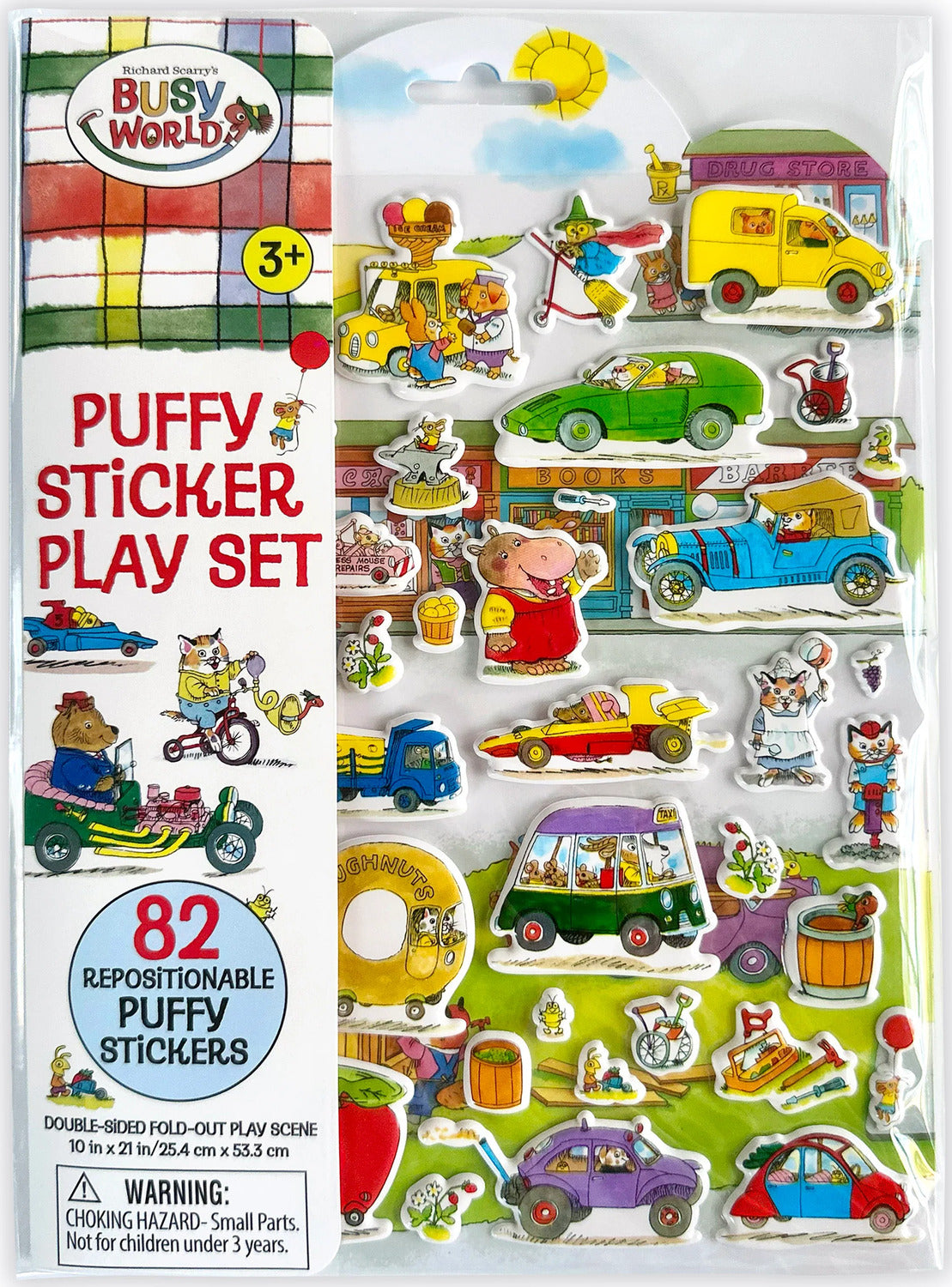 Richard Scarry's Busy World® Puffy Sticker Playset has a double-sided roadway scene! Endless storytelling with 130 puffy reusable stickers depicting Lowly the Worm in his Apple Car, Bananas Gorilla in his Banana Car and tons more. The special adhesive can be rinsed off if the stickers fall on the floor. Instead of one-time use, the stickers can be repositioned, again and again. Playtime starts right away. The perfect activity to keep kids 3+ engaged for long periods of play.