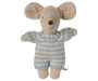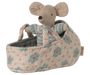 Meet the adorable Maileg Baby Mouse, dressed in a cozy striped knitted suit and snuggled up in its quilted carry cot. This wee one loves to snooze for hours, making it the perfect companion for your little one's imaginative playtime.